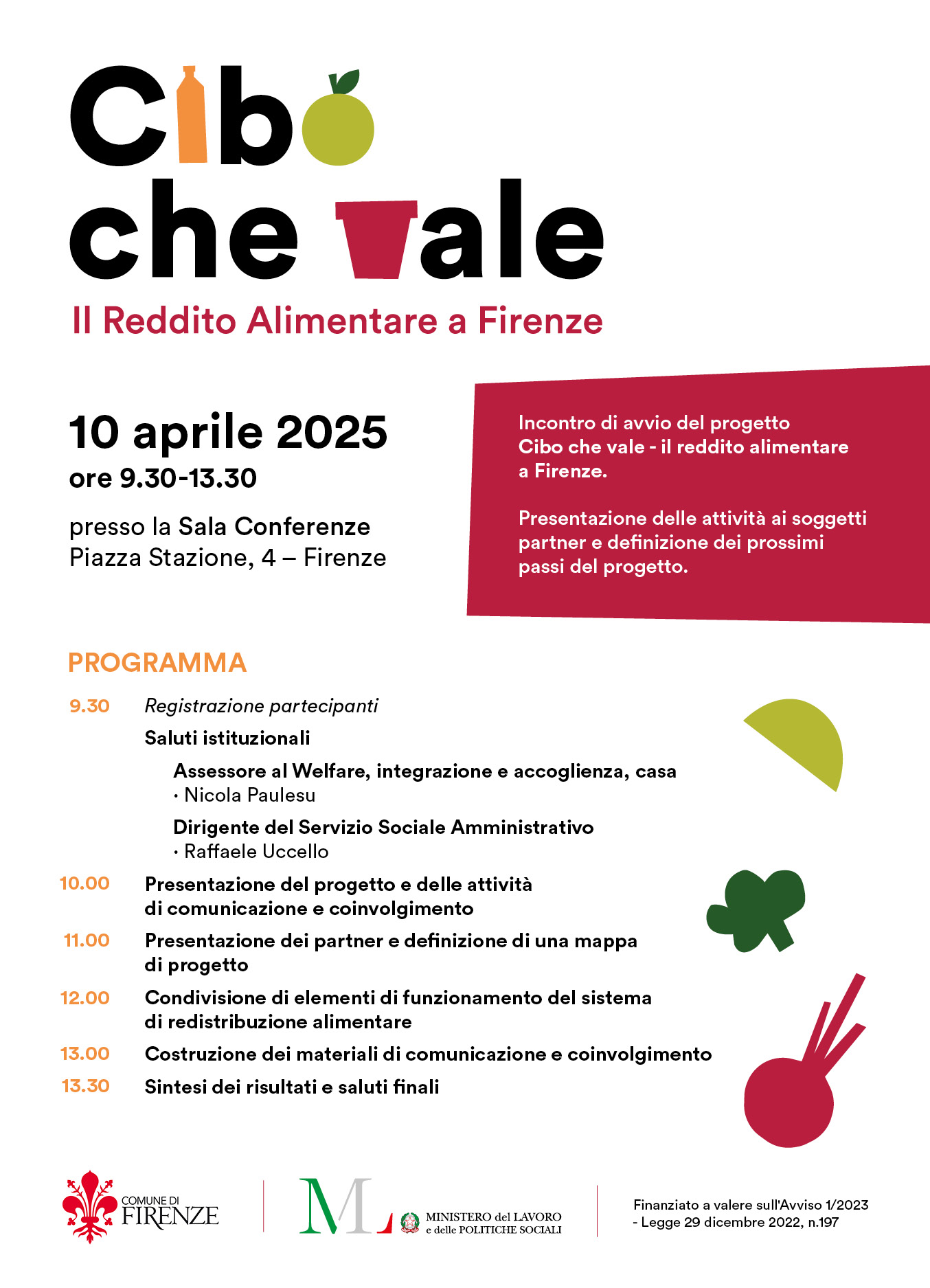 Cibo che vale - Il Reddito alimentare a Firenze è una sperimentazione finanziata dal Ministero del Lavoro e delle Politiche Sociali tramite l'Avviso 1/2023. Firenze, insieme a Genova, Napoli e Palermo, è stata scelta per questa sperimentazione pilota volta a ridurre lo spreco alimentare attraverso la creazione di una rete virtuosa di collaborazione tra operatori economici del settore alimentare ed enti del terzo settore.